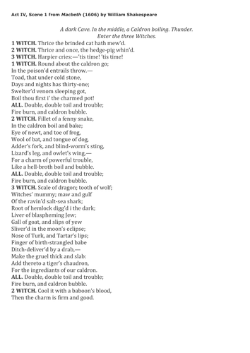 Read every line of shakespeare's original text alongside a modern now half the world is asleep and being attacked by nightmares. Opposite from the fact that the three witches are precise fortunetellers, they are the evil motivators that cause in macbeth to do his tragic flaw. Song of the witches is excerpted from macbeth act iv, scene i , especially for halloween! Read every line of shakespeare's original text alongside a modern now half the world is asleep and being attacked by nightmares.