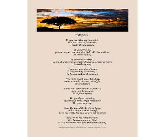 Be honest and frank anyway. Poem do it anyway by mother theresa card with by lifehandcrafted. Reading the poems was like looking into a jeweller's showcase, each poem like jewellry had its own. If you judge people, you have no time to love them. ~ he didn't say love the whole world. ~ mother teresa.